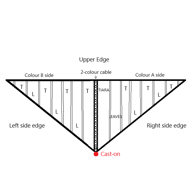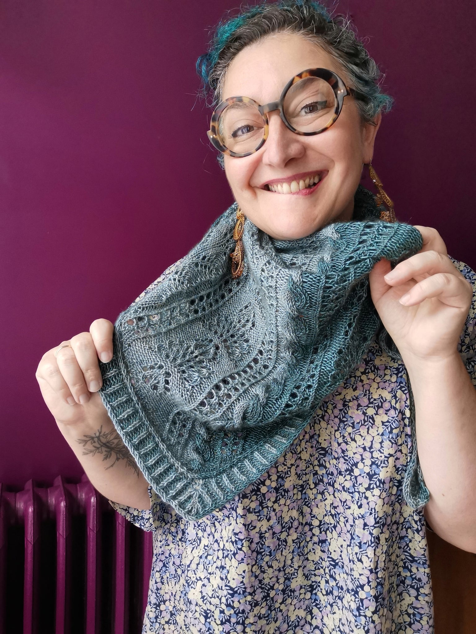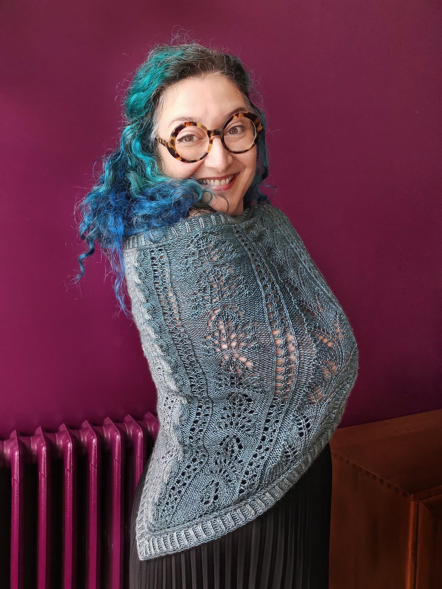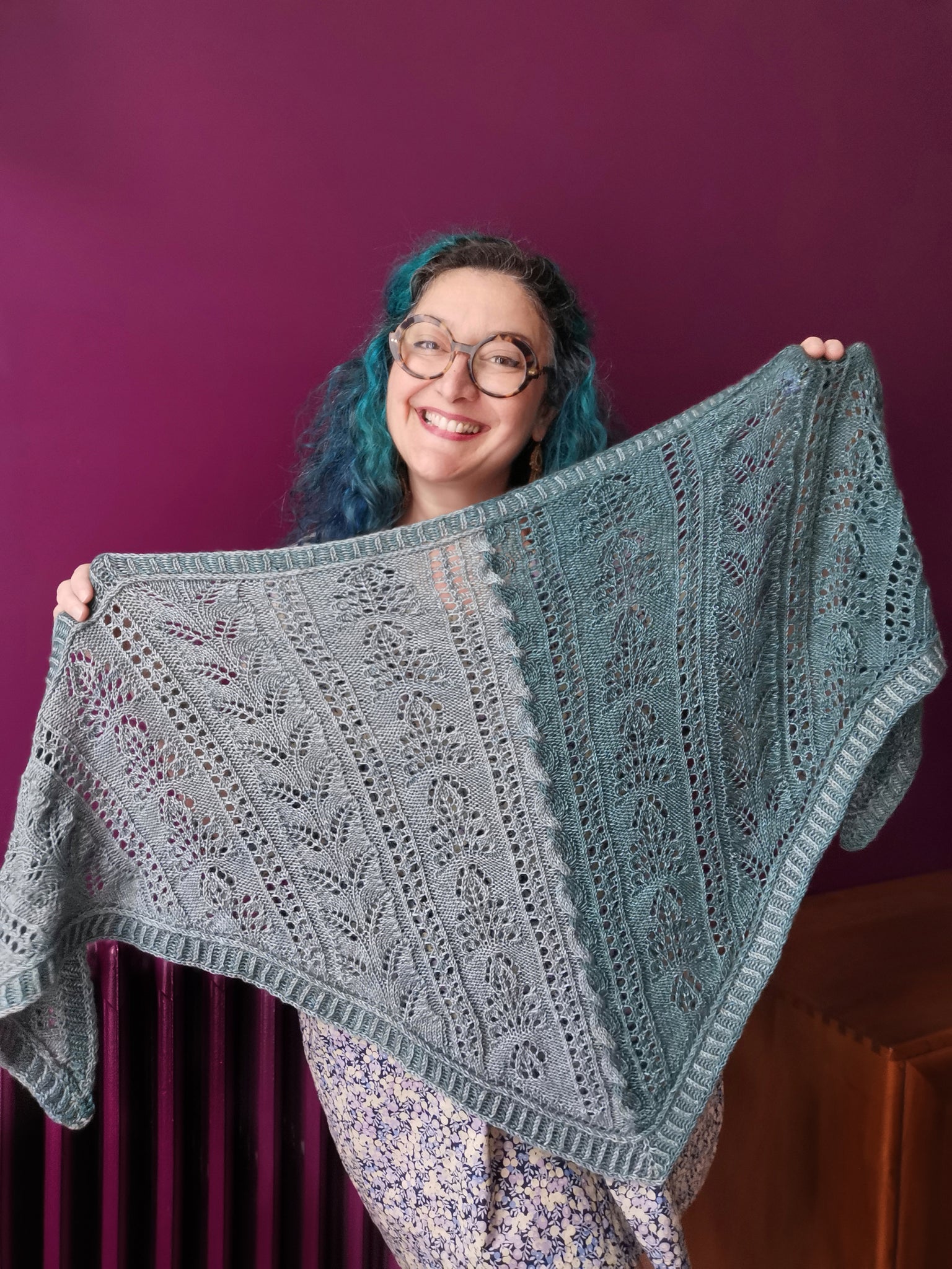 Filigree Triangle est un châle triangulaire bicolore qui revisite le motif dentelle de la famille Filigree avec une petite surprise inattendue : l’intarsia !
