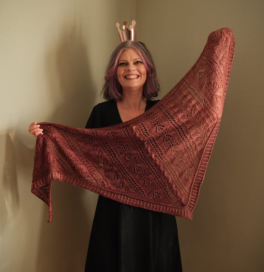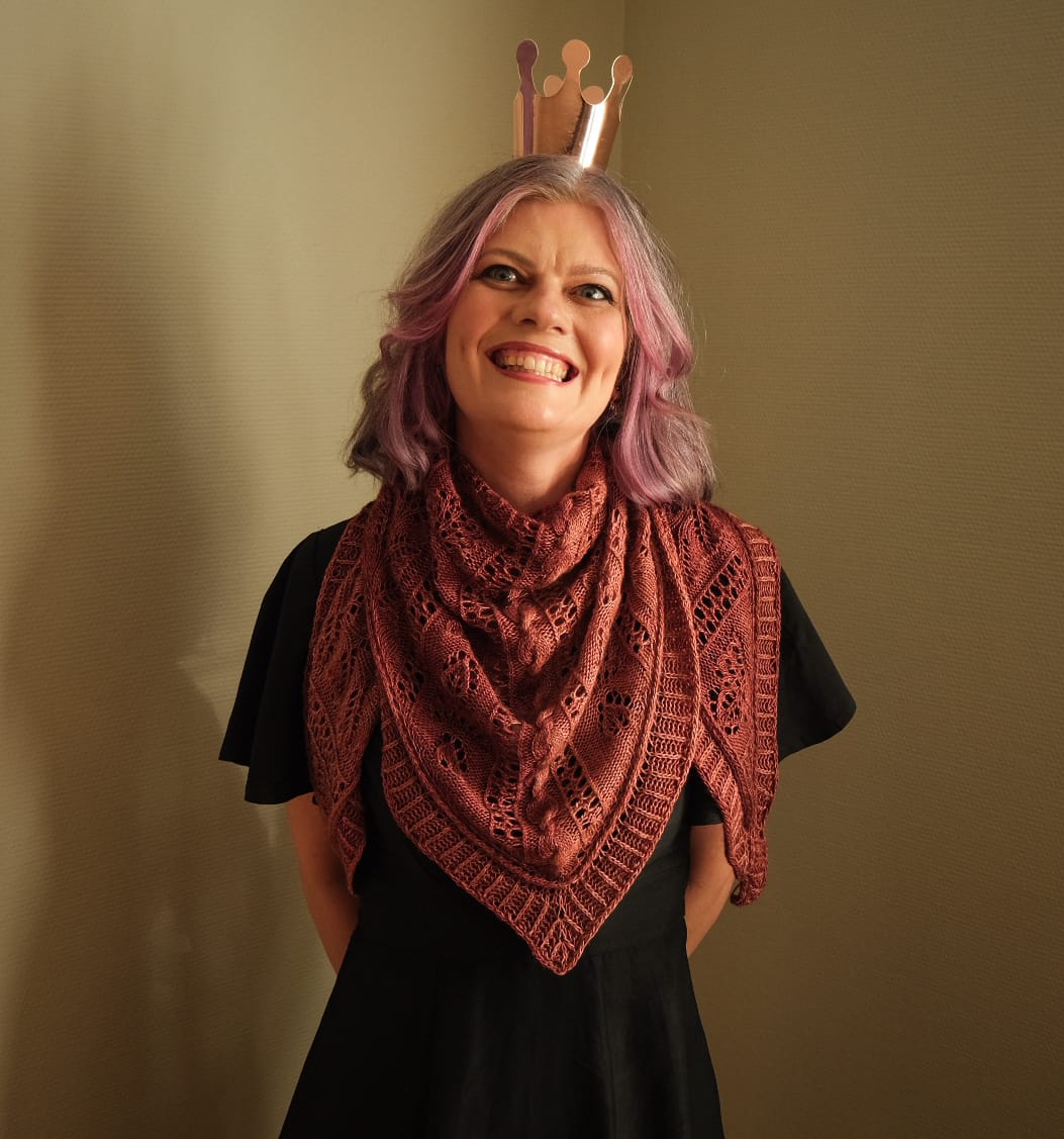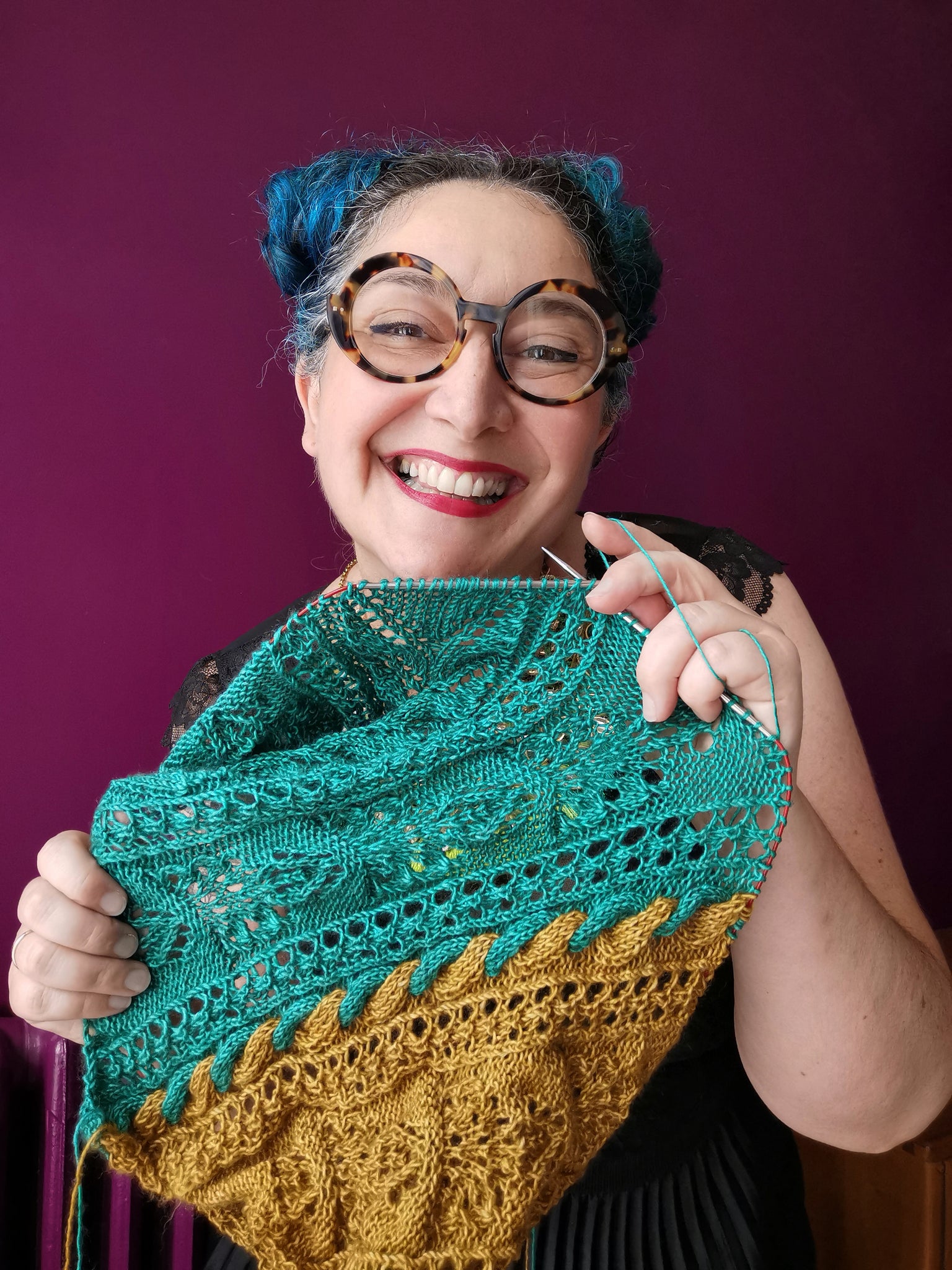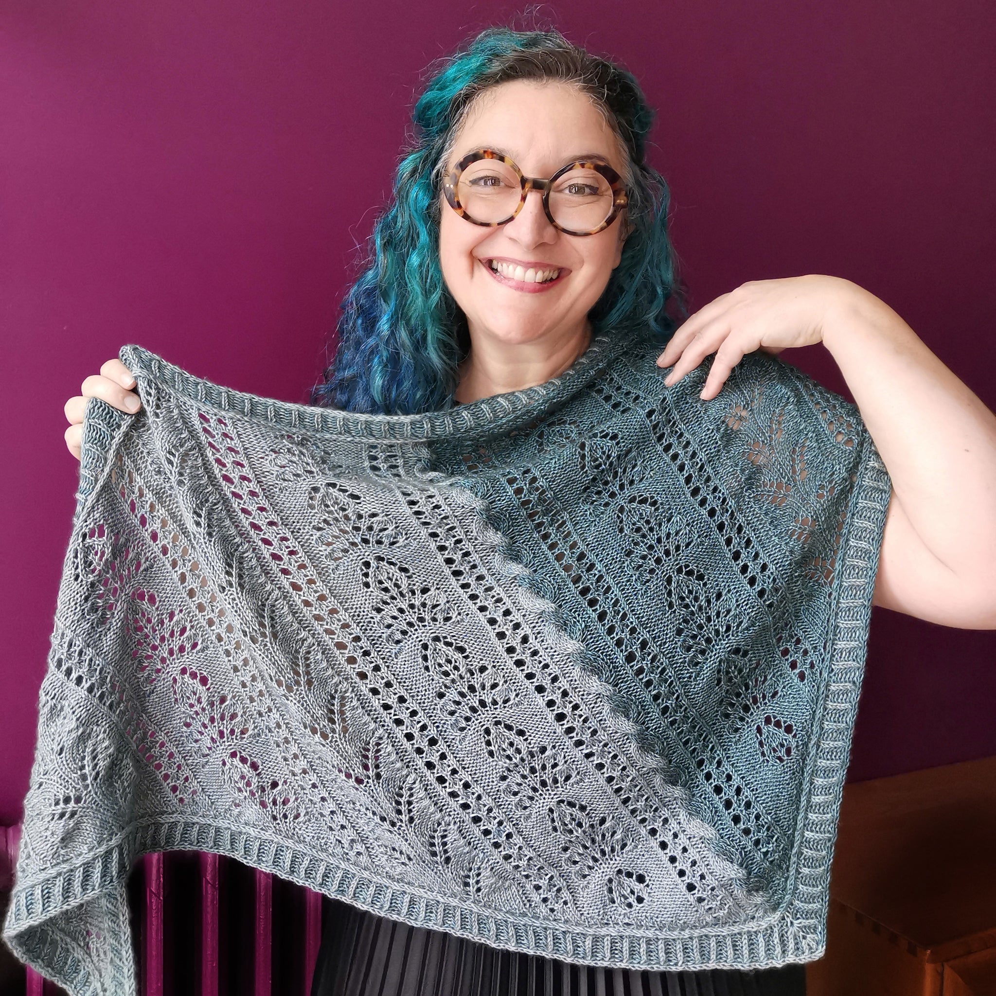 Welcome to the Filigree Triangle, a 2-skein and 2-colour shawl that revisits the Filigree lace motif with a surprising intarsia twist.