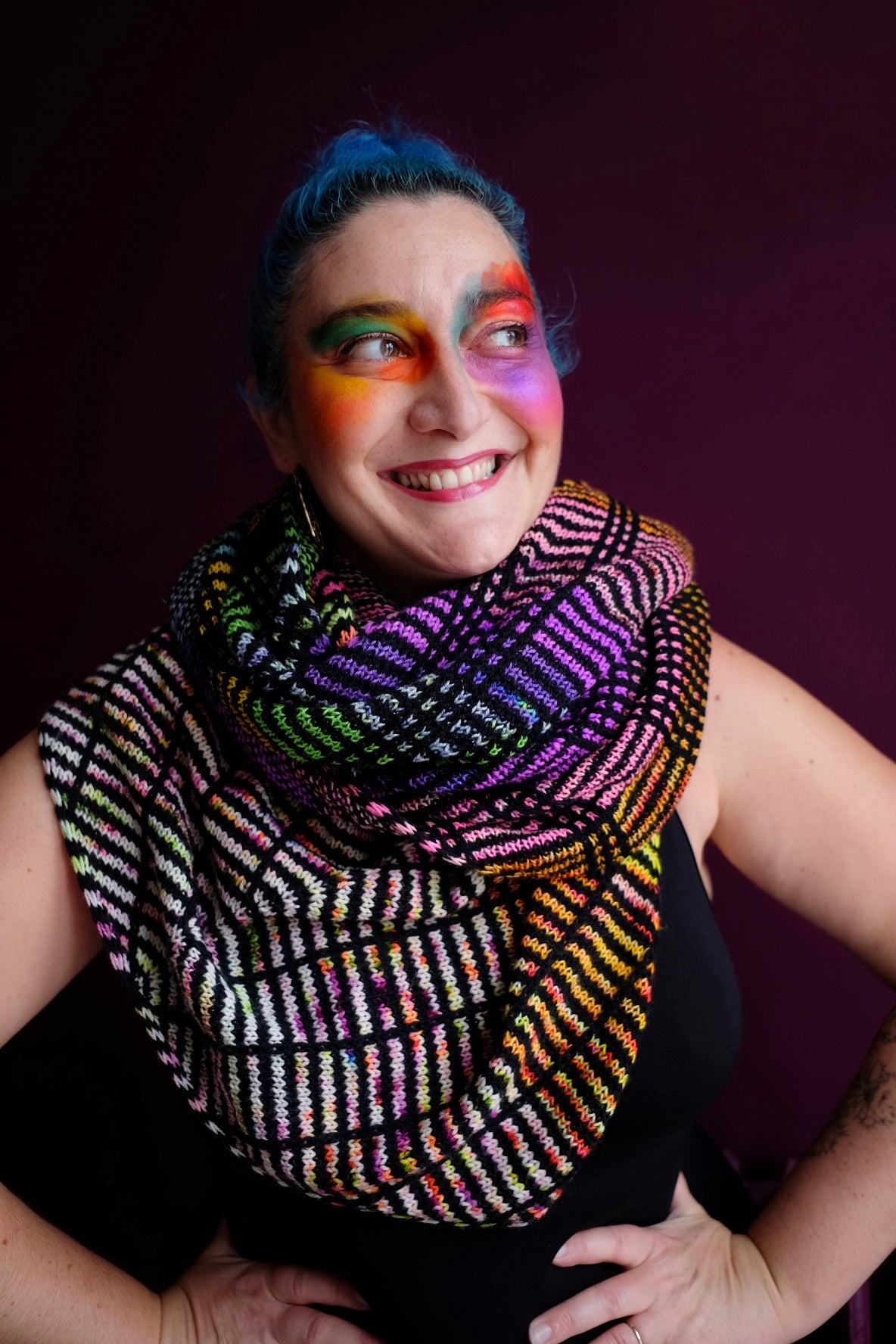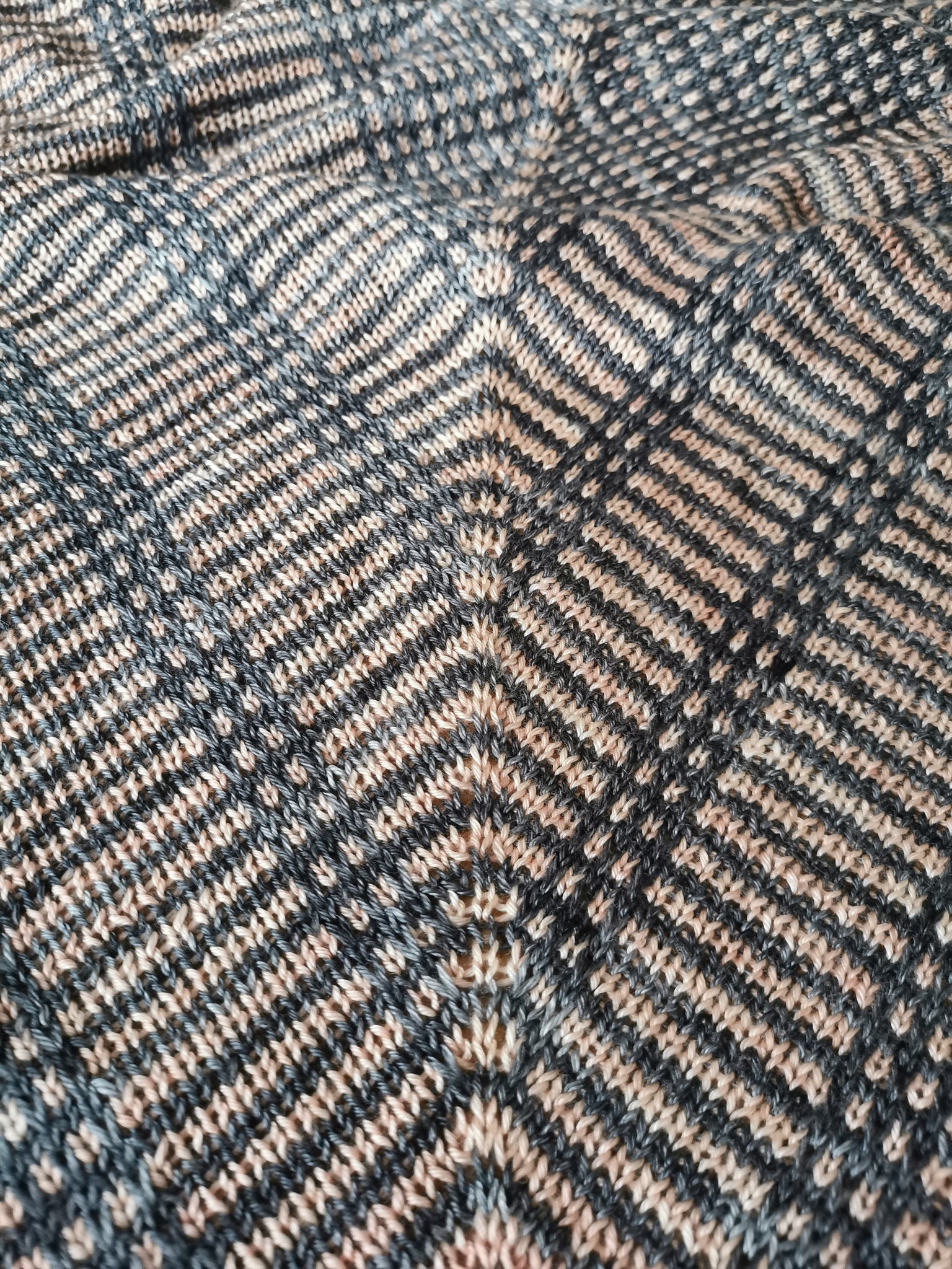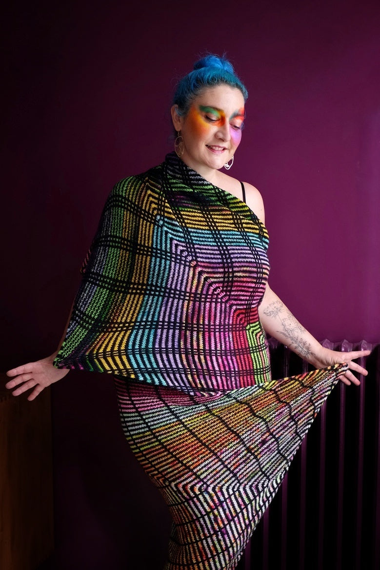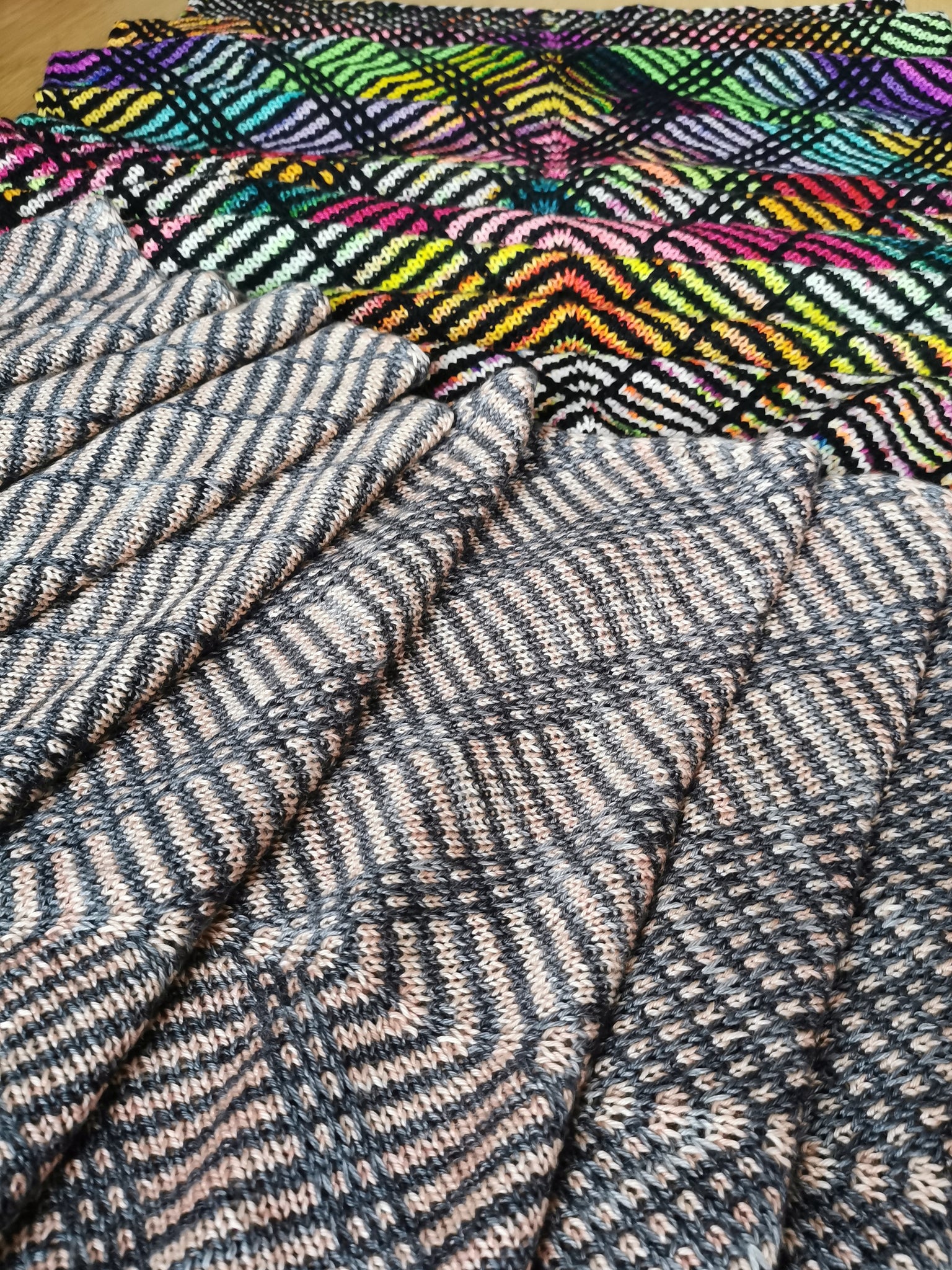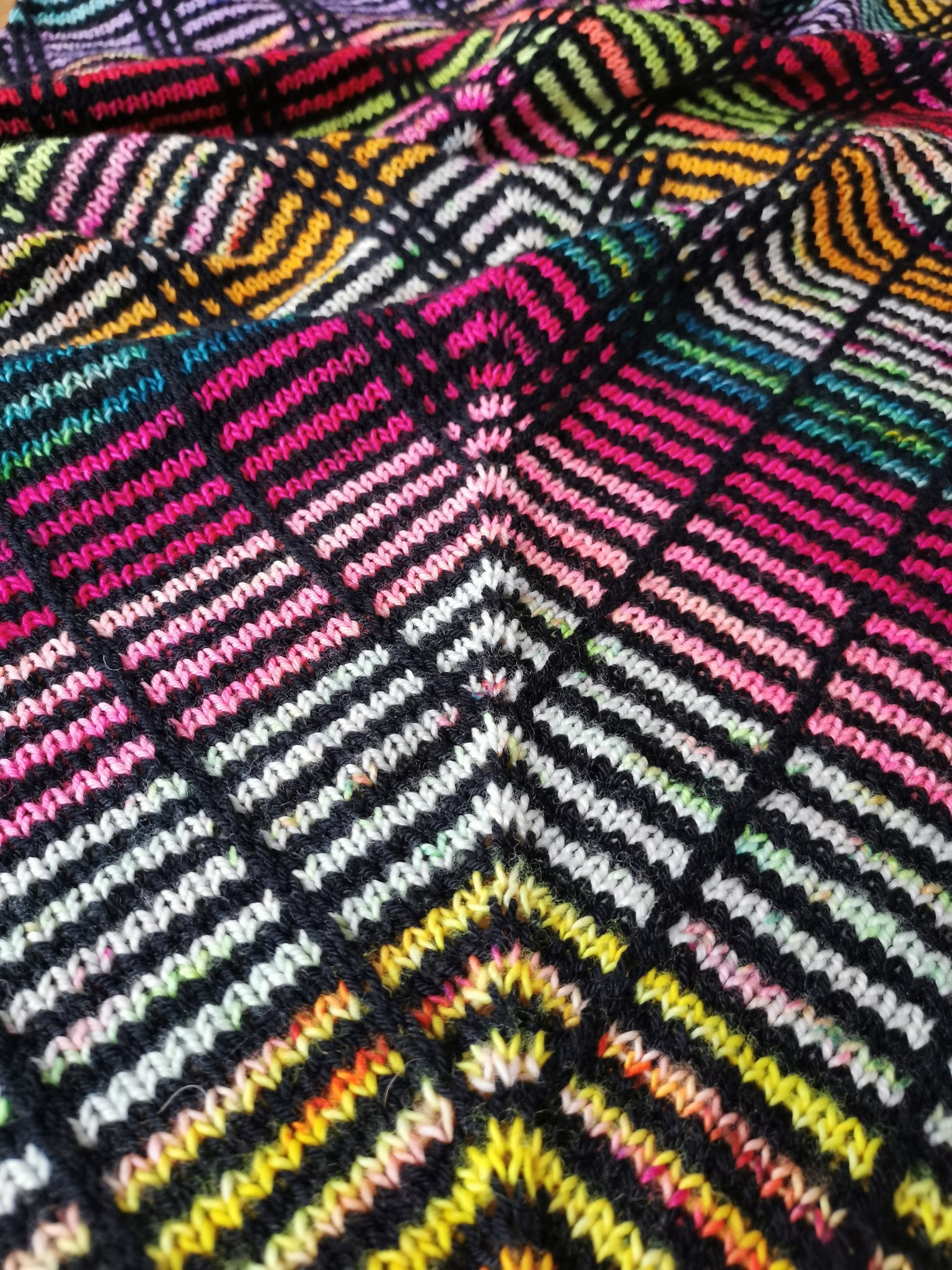 The graphic motifs are created by straight lines of slipped stitches against a background of striped stocking stitch fabric.