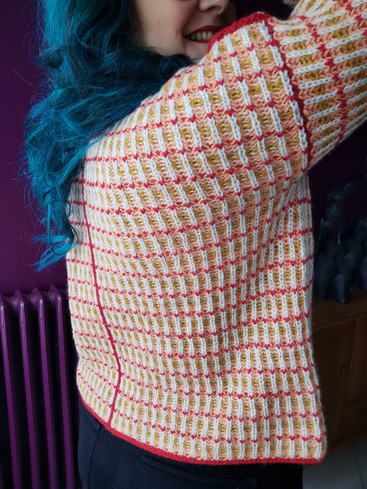 Colourwork yarn ends are encased in a contrasting stripe down the back and along the sleeves, so that the usually untidy beginning of round where colour changes happen becomes a neat feature in the design.
